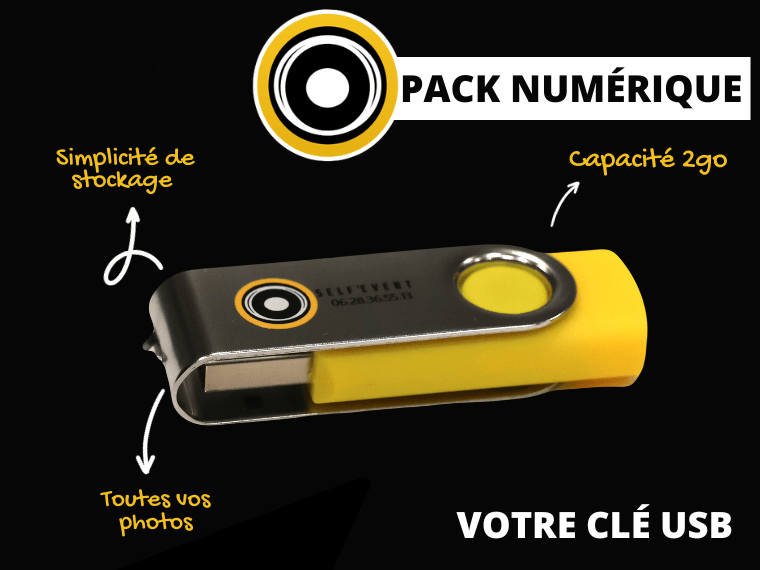 Le pack numérique comprend une clé USB contenant l’ensemble des photos/vidéos réalisées au cours de votre événement. Cette clé vous est délivrée dès le retrait de notre Photobooth/Livre d’or vidéo, au lendemain de votre événement.
